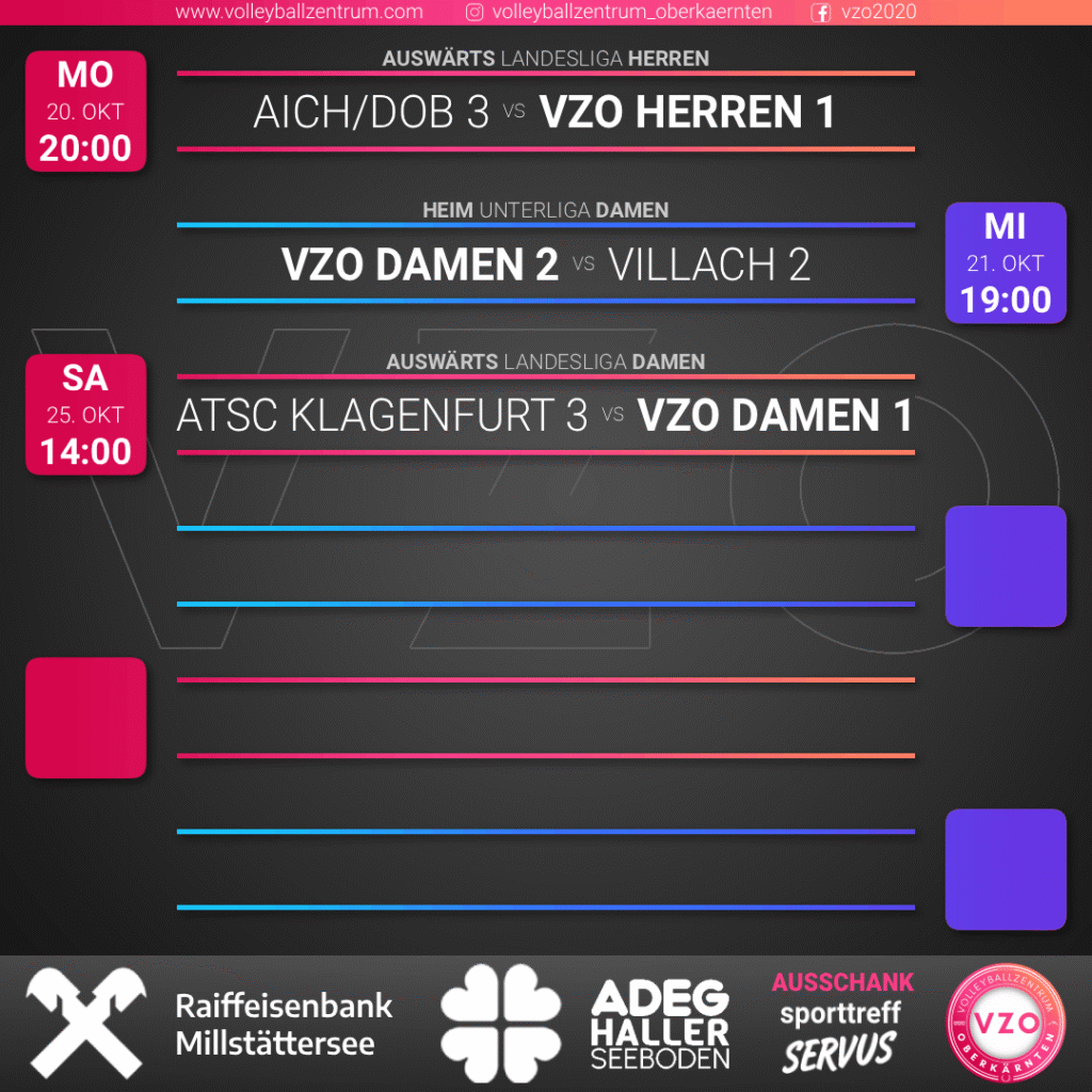 Mittlerweile sind alle unsere Teams in den Ligabetrieb gestartet – diese Woche geht das Kräftemessen mit den Wörtherseelöwen in die nächste Runde, außerdem steht wieder ein Heimspieldoppel am Volleyball-Samstag an!